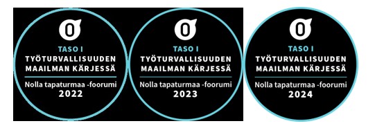 Työturvallisuudesta huolehtiminen on tärkeä osa yrityksemme toimintaa, ja organisaatiomme panostaa turvallisuusasioiden jatkuvaan koulutukseen, valvontaan ja raportointiin. Siten voimme varmistaa korkealuokkaisen työturvallisuuden kaikissa toiminnoissamme. Meillä on sertifioitu työturvallisuusjärjestelmä (ISO 45001:2018). Kuulumme Nolla Tapaturmaa Foorumiin, joka on palkinnut yrityksemme tasoluokituksessaan.